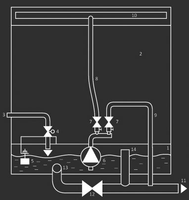 В процессе испарения содержание соли в оборотной воде повышается и может достичь уровня при котором соль будет откладываться на материале кассеты и элементах конструкции. Для поддержания концентрации солей в оборотной воде часть ее через специальную отводную линию сбрасывается в дренаж. Вместо нее в поддон оборотной воды поступает новая вода из трубопровода и разбавляет оборотную воду до нормального уровня содержания соли. Величина отводного потока настроена на заводе, но в некоторых случаях может потребоваться корректировка. Для этого служит регулирующий кран (7) и расходомер на линии отводного потока водораспределительной гребенки. Для исключения возможности перелива воды в поддоне выполнена линия перелива (14) в дренаж. Для полного осушения поддона имеется линия слива (13) с шаровым краном(12).